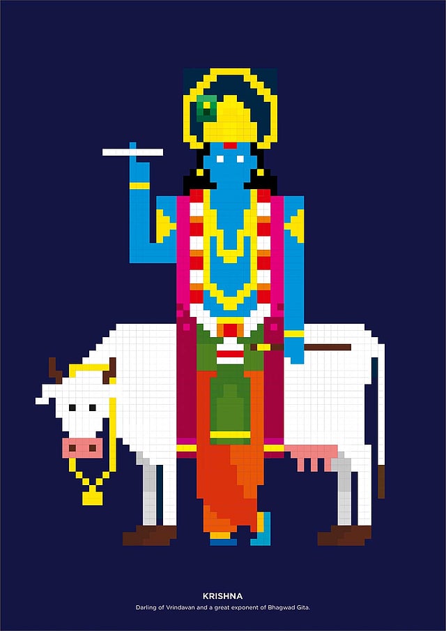 Initially filling the grids on paper forming characters pixel by pixel inspired him to draw with digital tools that are now a complete set of deities. Pixel characters are intricate, with a simple plain background and typeface keeping the character details prominent. In order to realise his future plans for animations, he has kept these illustrations minimalistic.